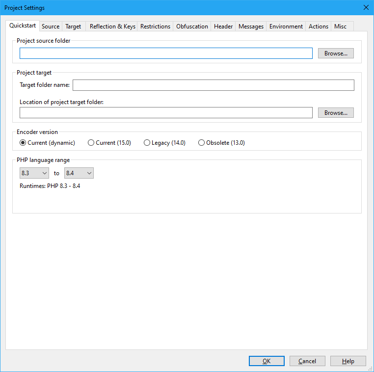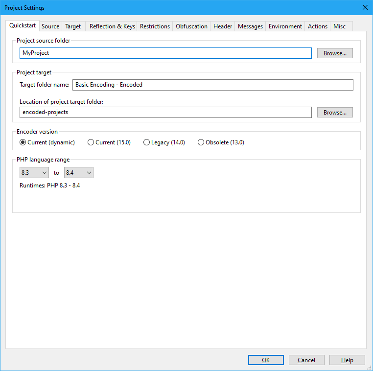 Lastly, set the PHP source language range which is the range of PHP versions being run on target machines where you want to deploy your encoded files. For example if you set PHP 7.1-8.4 then the encode will automatically bundle together all the required files for these target PHP versions.