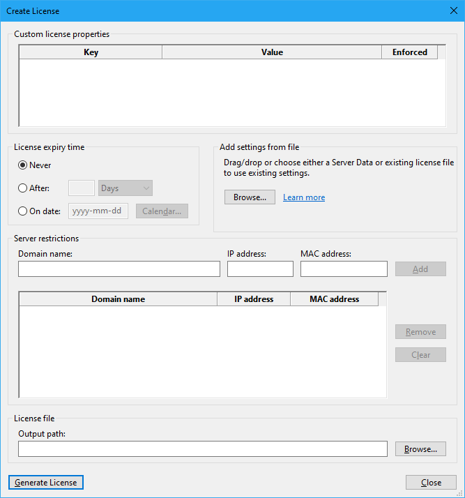 In the “Server restrictions dynamic fields” category, if “Show restrictions grid” is set to enabled, the license creation and restriction table is displayed in the “Custom Settings” tab on the main window. This can be used to quickly create license files for different servers. Note that this functionality requires the Special Edition GUI.