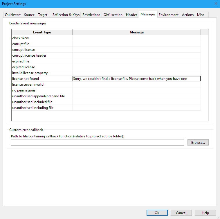 Custom error messages can be set on encoded files which will override the default messages provided by the Loader. This is useful for specifying additional information to the users of your scripts, such as instructions to follow, or stating websites to visit for support.