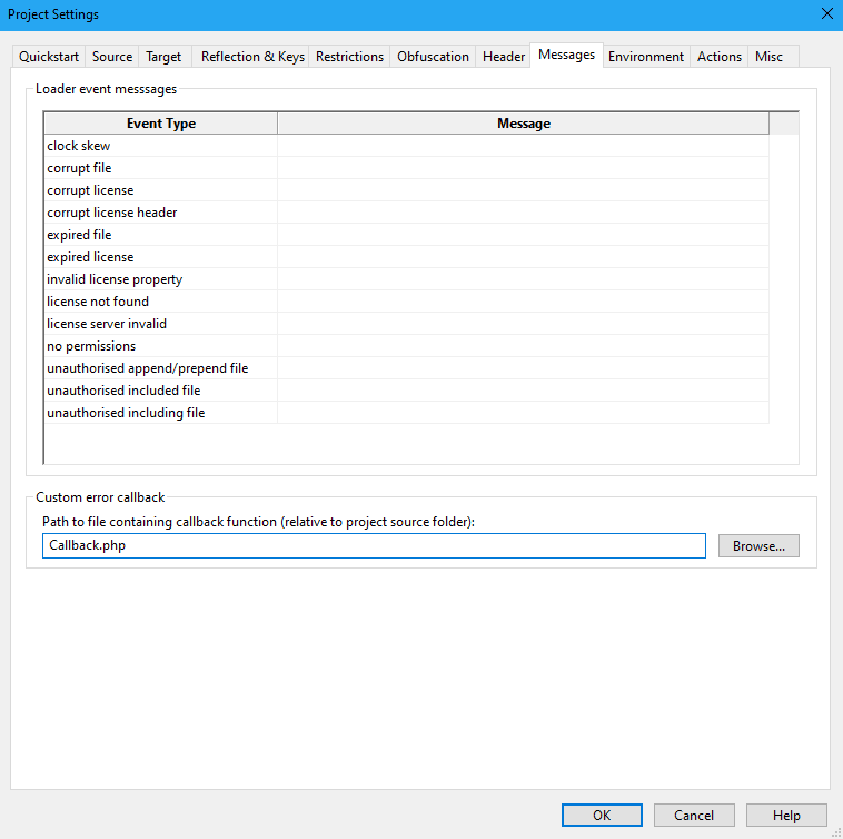 Next, we need to tell the encoded files where the callback file is. This can be specified in the same screen as before, on the “Project” > “Project Settings” > “Messages” tab.
