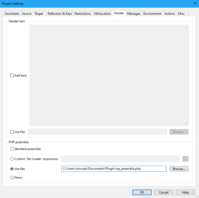 When files are protected with ionCube they are encoded at a binary level, this means WordPress is no longer able to scan the mangled output for the header preamble required to register the plug-in. This issue can be resolved by customising the appearance of your encoded file output to contain a plain text header along with the standard ionCube preamble. If you are using the GUI, custom header preambles for encoded files can be set on the ‘Header’ tab (‘Customisation’ on older versions of ionCube) of your project settings which include the required WordPress plug-in preamble as part of a custom PHP preamble file.